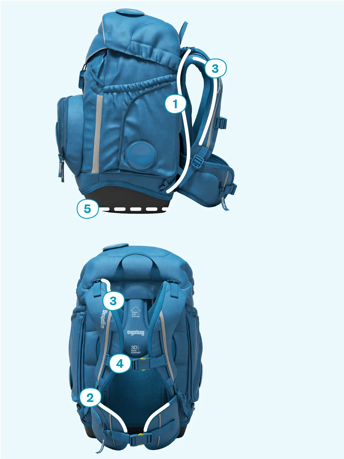 Disse 5 punkter sikrer, at skolerygsækken sidder korrekt.