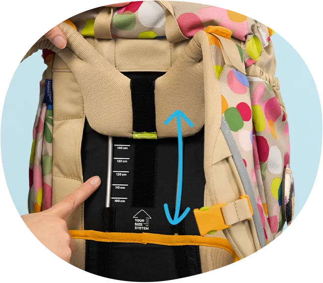 Fold bagsiden ud, og juster skulderremmen til barnets højde. Om nødvendigt kan højden justeres, skalaen er kun vejledende. Fordi hvert barn er unikt!