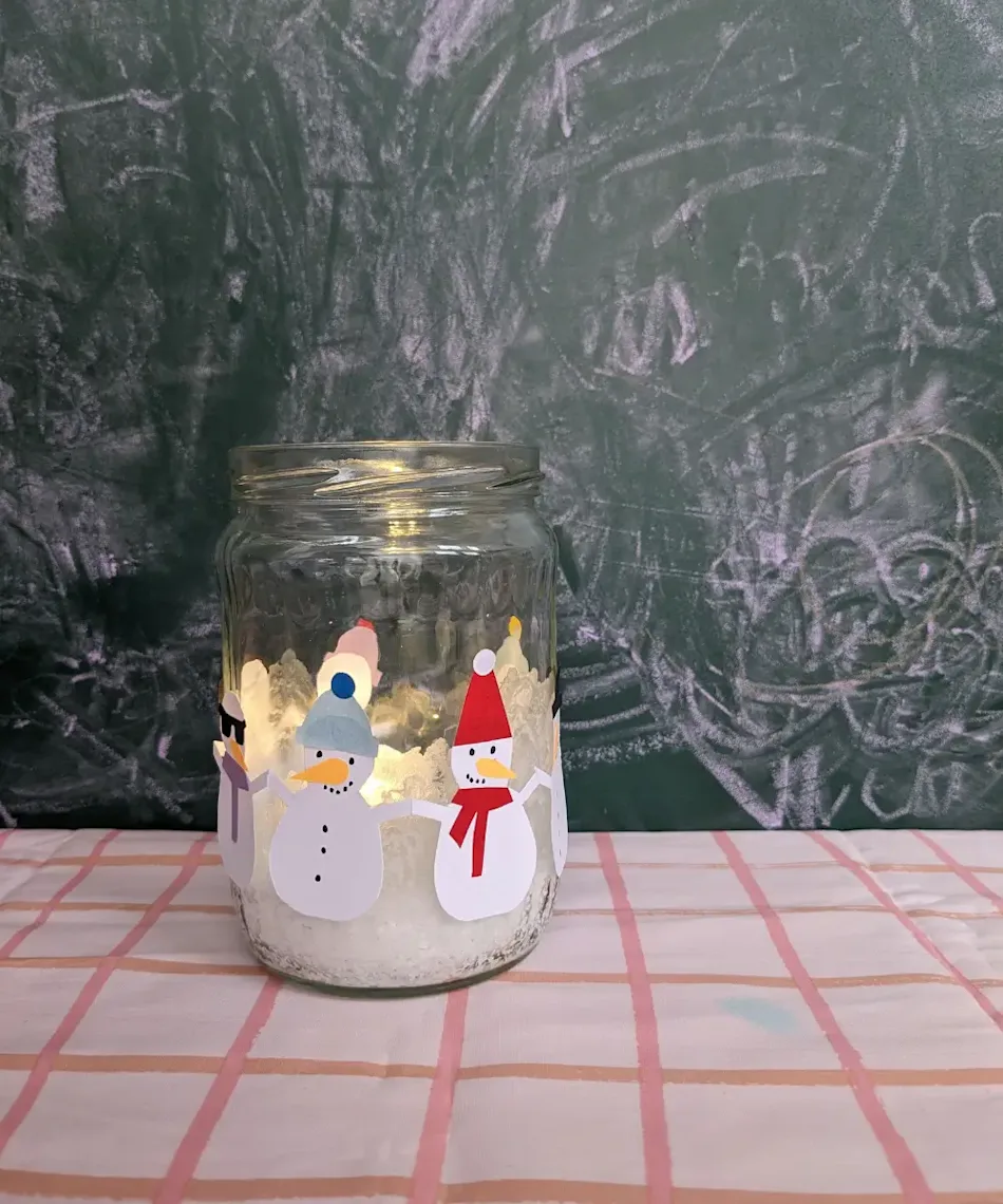Deine Scherenschnitte kannst du nun nach Lust und Laune mit Augen, Mützen, Schals und Ohrenschonern verzieren und um dein fertiges Salzfrostglas kleben.