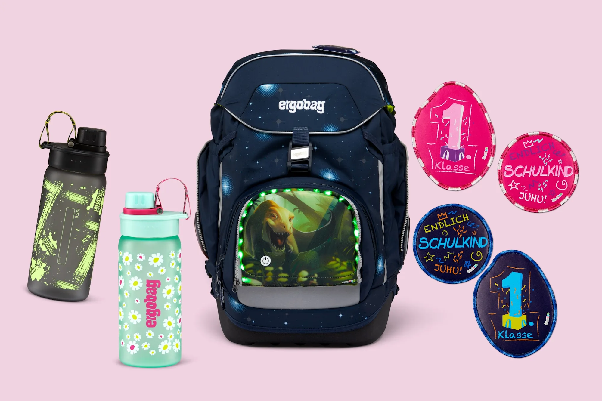 Auch beim ergobag Zubehör haben wir einige Highlights mit der neuen Kollektion zu zeigen. So haben wir unsere Trinkflaschen komplett überarbeitet. Statt einem Trinknoppen aus Silikon haben sie nun einen Schraubverschluss. Dieser ist mit einer Schlaufe befestigt, so dass er nicht verloren gehen kann. Das neue Design sorgt dafür, dass die Trinkflasche einfacher zu reinigen ist und der Deckel sicherer verschlossen bleibt. Der erste Schultag ist ein natürlich immer ein ganz besonderes Highlight. Daher haben wir einige Kletties passend zur Einschulung designt. Diese können Eure stolzen Kids zum ersten Schultag begleiten und bleiben danach eine tolle Erinnerung. Damit Ihr Euren ergobag noch weiter individualisieren könnt und Eure Kids trotzdem gut sichtbar sind, haben wir zudem neue LED-Zippies im Angebot. Diese haben unterschiedliche Motive, bei denen für jeden Geschmack etwas dabei ist. Außen in den Zippies sind LEDs angebracht, die in unterschiedlichen Leuchtmodi besonders sichtbar sind.