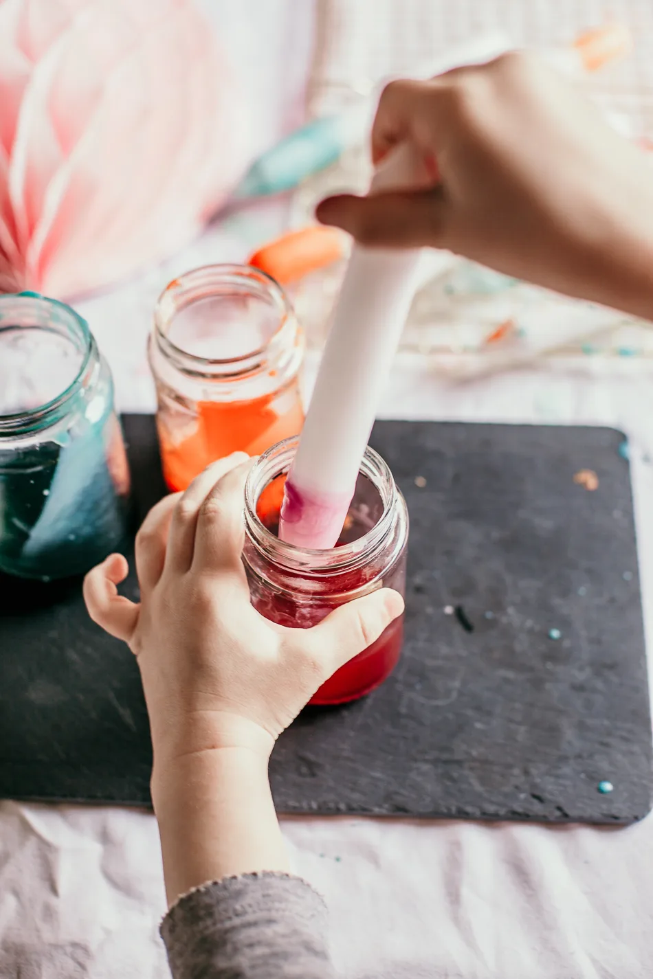 Jetzt kommt der spaßige Teil! Ihr könnt mit dem Färben beginnen. Dabei könnt ihr einfach die Kerzen in die Gläser tunken oder ihr haltet die Gläser schräg, um die Farbe quer auf die Kerze zu bekommen.