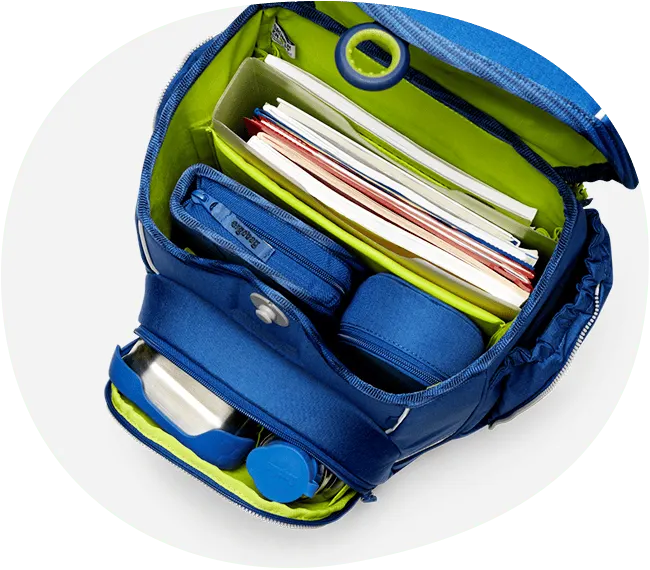 Nello scomparto anteriore ci stanno il contenitore del pranzo e la borraccia. Questo scomparto è anche a prova di fuoriuscite, in modo che i quaderni siano sempre al sicuro.